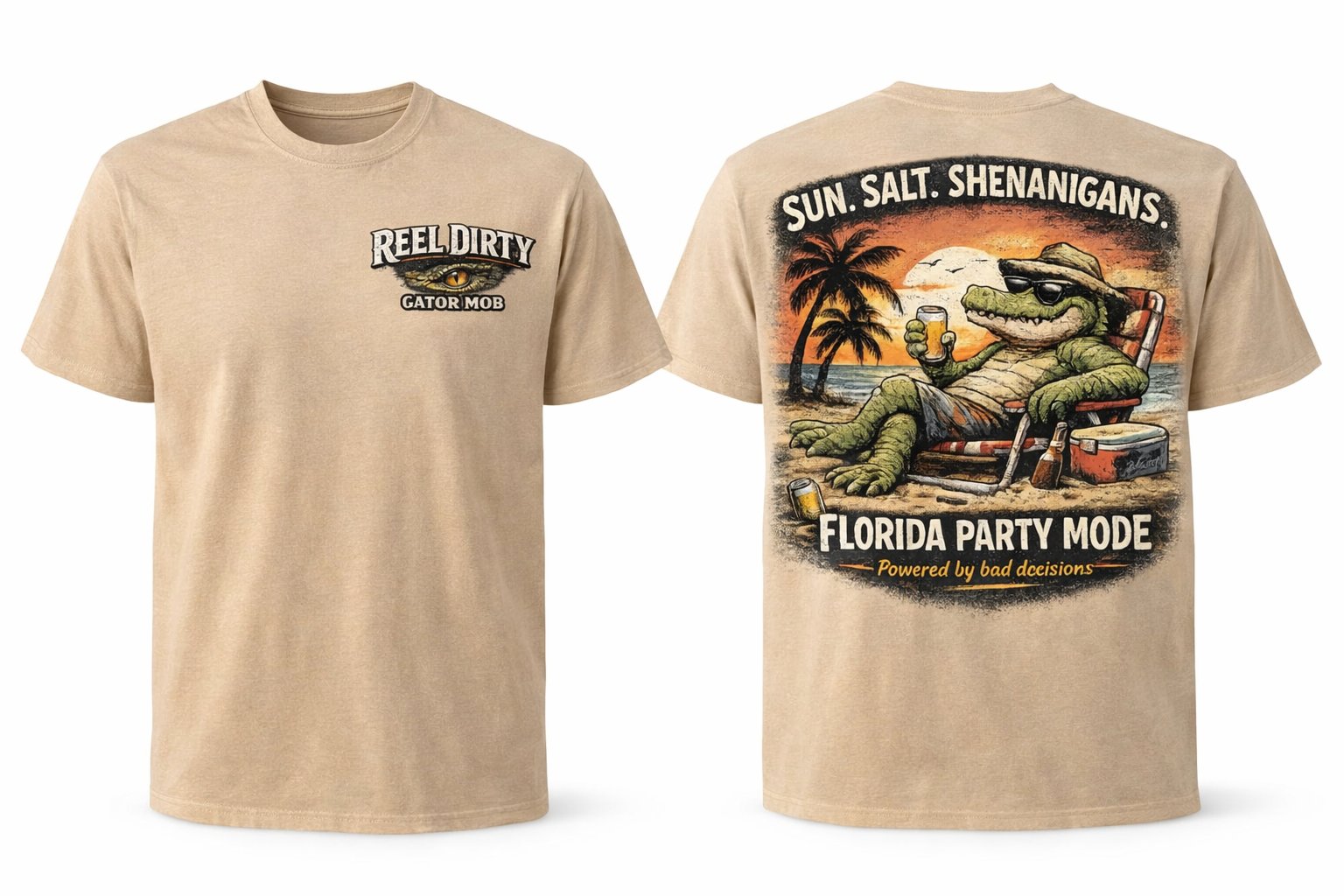 Featuring a laid-back gator posted up in full beach mode, drink in hand and not a care in the world, this design brings humor, attitude, and straight-up party energy to your everyday fit. The bold back graphic captures that perfect mix of sunset vibes and bad decisions, while the clean Reel Dirty chest hit keeps it dialed in up front.