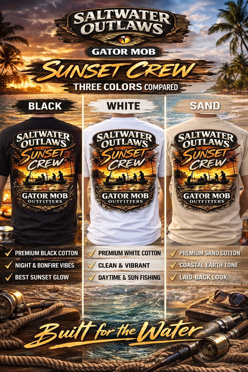 Where the water calms, the lines drop, and the stories begin—the Saltwater Outlaws Sunset Syndicate Tee captures the heart of Florida’s golden hour.